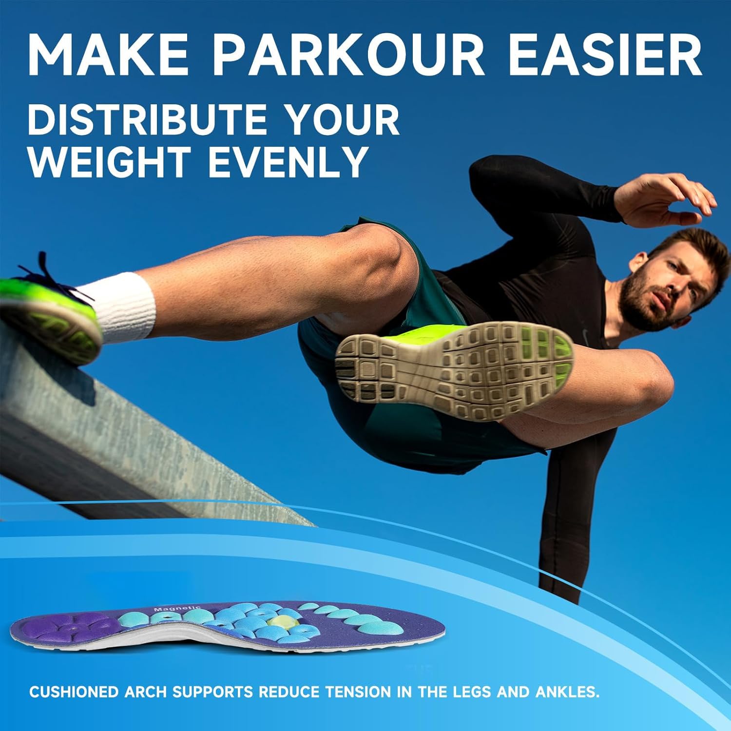 Crafted with high-elastic EVA and suede, the insoles provide anatomical arch support to stabilize your gait, lower joint stress, and prevent injuries from prolonged standing/walking. Gel/PVC cushioning layers absorb impact, making them perfect for athletes, busy workers, or anyone on their feet all day.