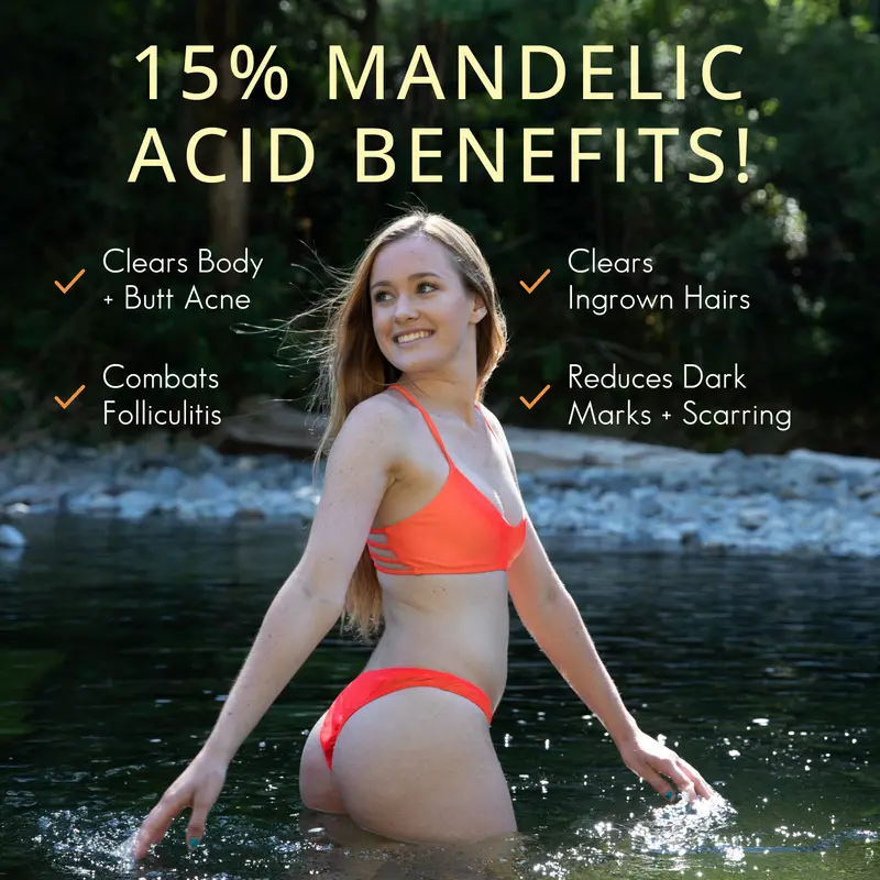 Struggling with butt acne, folliculitis, or fungal breakouts? Almond Clear Level 2 Serum uses 15% mandelic acid to penetrate pores, helping clear stubborn body acne while preventing new flare-ups—without harsh dryness.