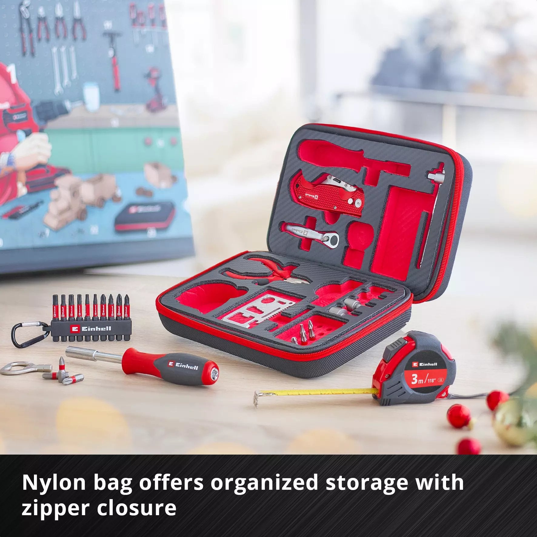 Behind 24 doors, a well-thought-out set of practical hand tools, bit and socket wrench inserts, cutting and measuring tools, and useful accessories are perfectly organised in a durable nylon tool bag with reinforced walls and a foam insert in a carbon look.