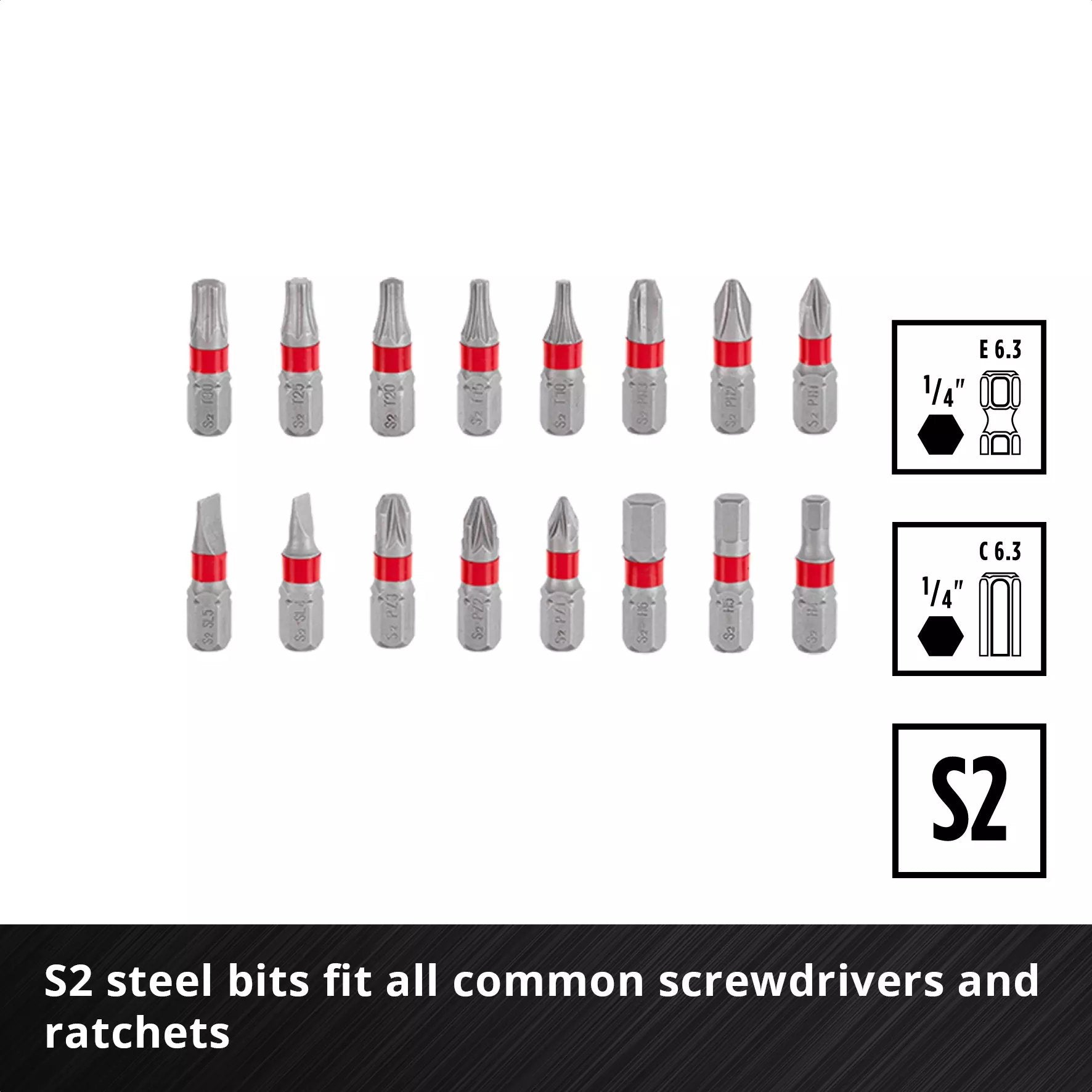 Thanks to the 1/4‘ C 6.3 or 1/4’ E 6.3 shank, all bits are compatible with standard screwdrivers and ratchets. The included mini ratchet, ergonomic screwdriver handle and T-handle with sliding piece allow flexible applications even in the tightest of spaces.