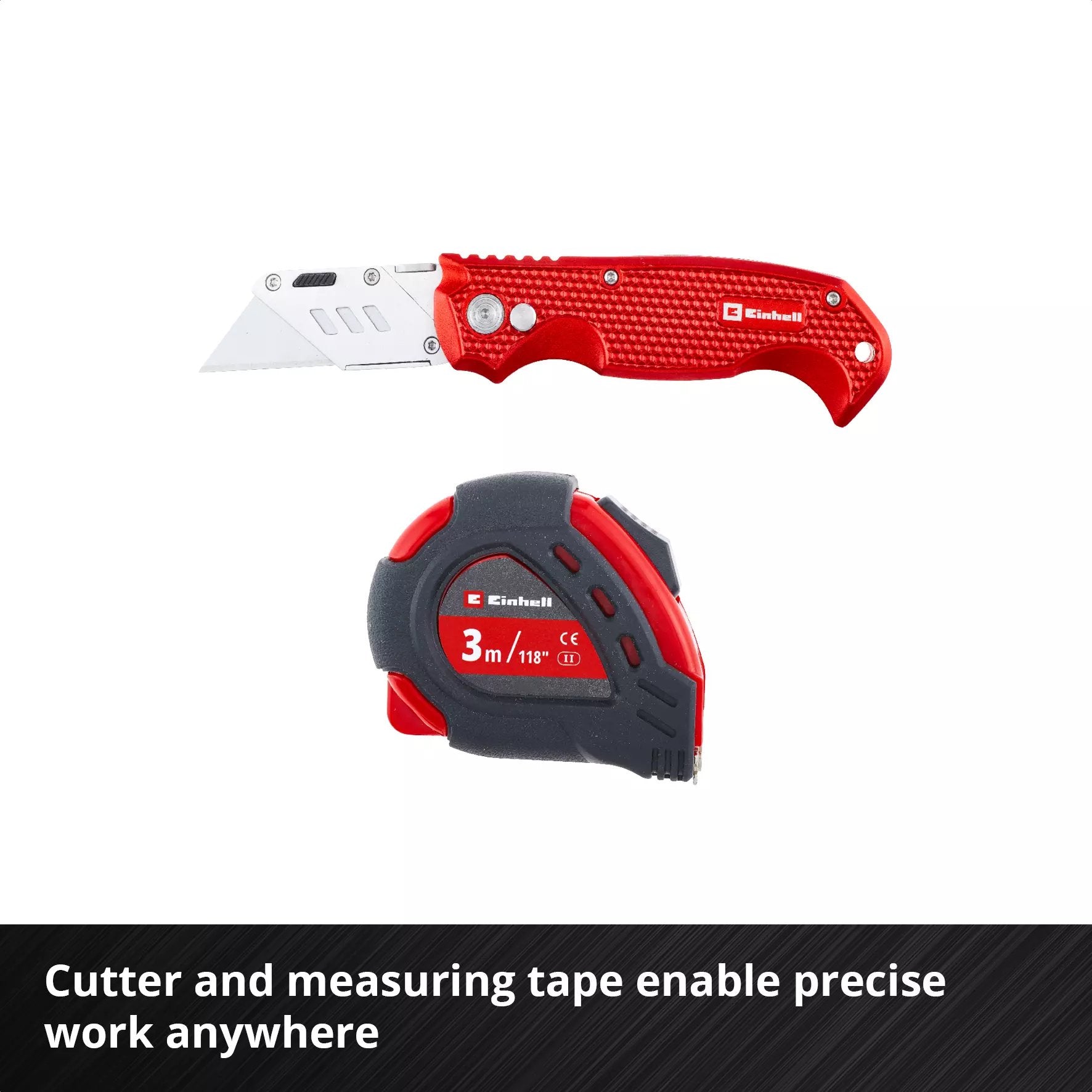 The cutter knife included in the set is impressive with its aluminium casing and belt clip, and comes with five replacement blades. Further highlights are the compact combination pliers and the 3-metre measuring tape with a steel band and rubber grip.
